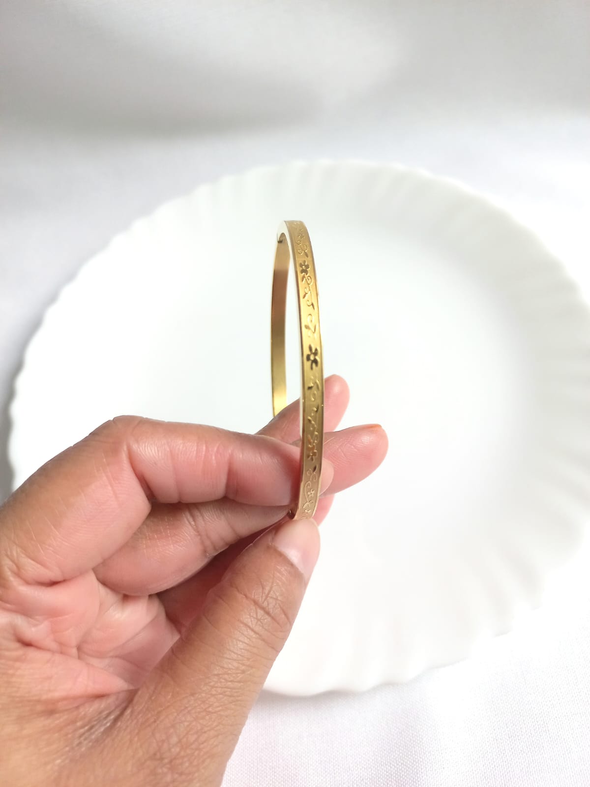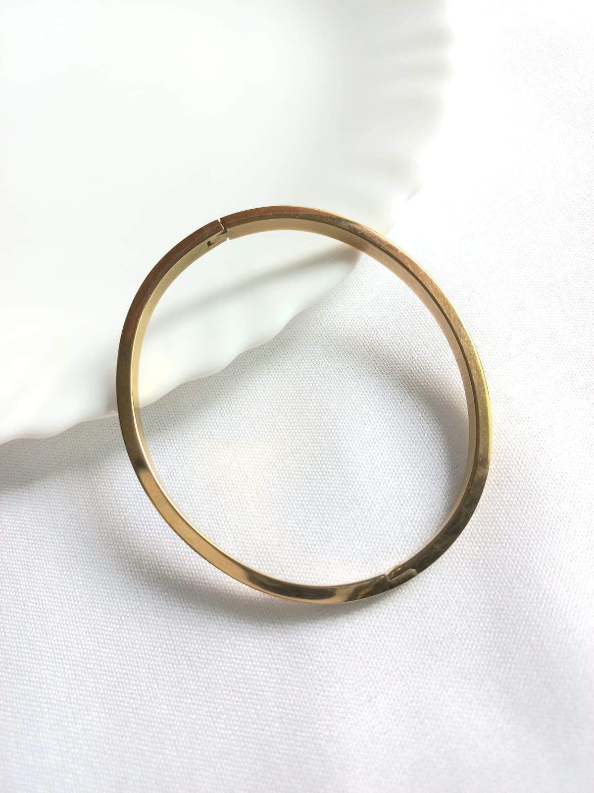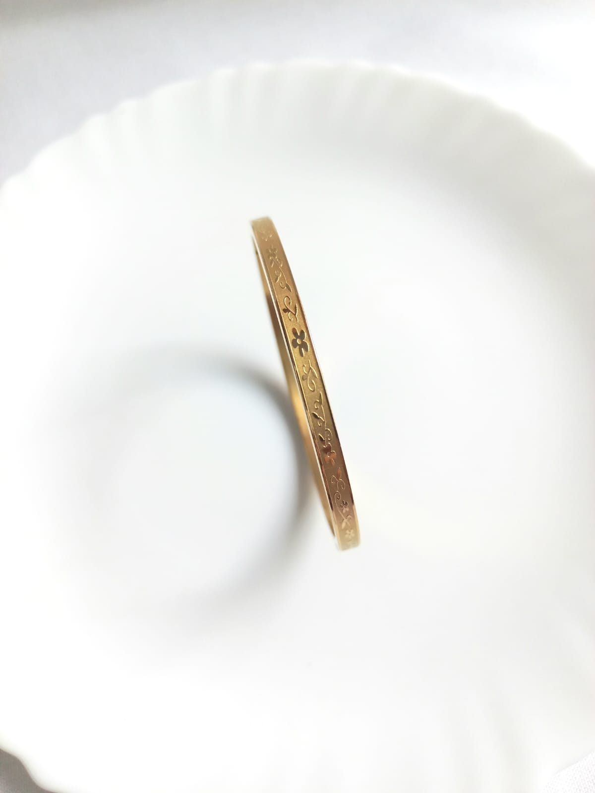 18k gold-plated stainless steel openable bracelet with self design. Looks like a real gold bangle. Will fit to 2.6-2.8 wrist size.