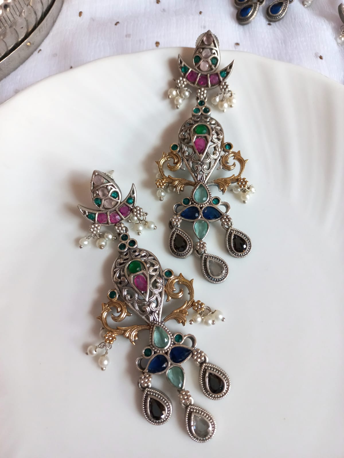 This stunning multicolor stone pair is a must-have for your collection. This pair has semi-precious stones with a dual-polished pure brass base. This is a super pretty piece to wear at the festive or wedding season.