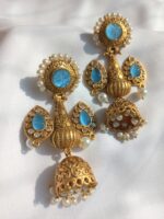 This is the prettiest jhumka for all the jhumka lovers. This pair comes with tiny pearls and natural hand-carved stones. This jhumka is very light in weight.