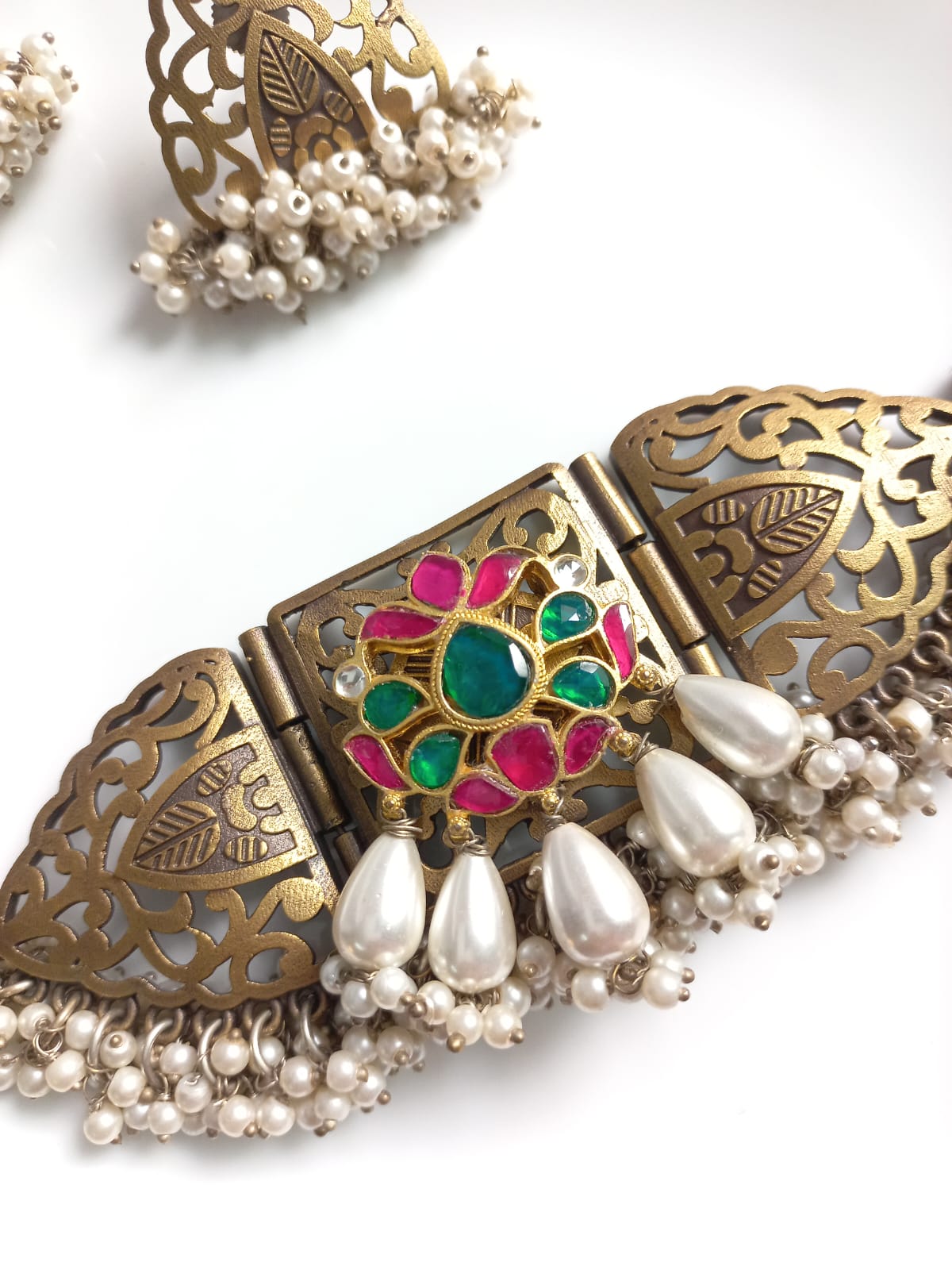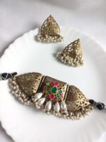 Mesmerizing antique polished choker to make you the showstopper. This beautiful choker has real pachi kundan embellishment and high-quality pearls drops. This choker comes with pair of matching earrings.