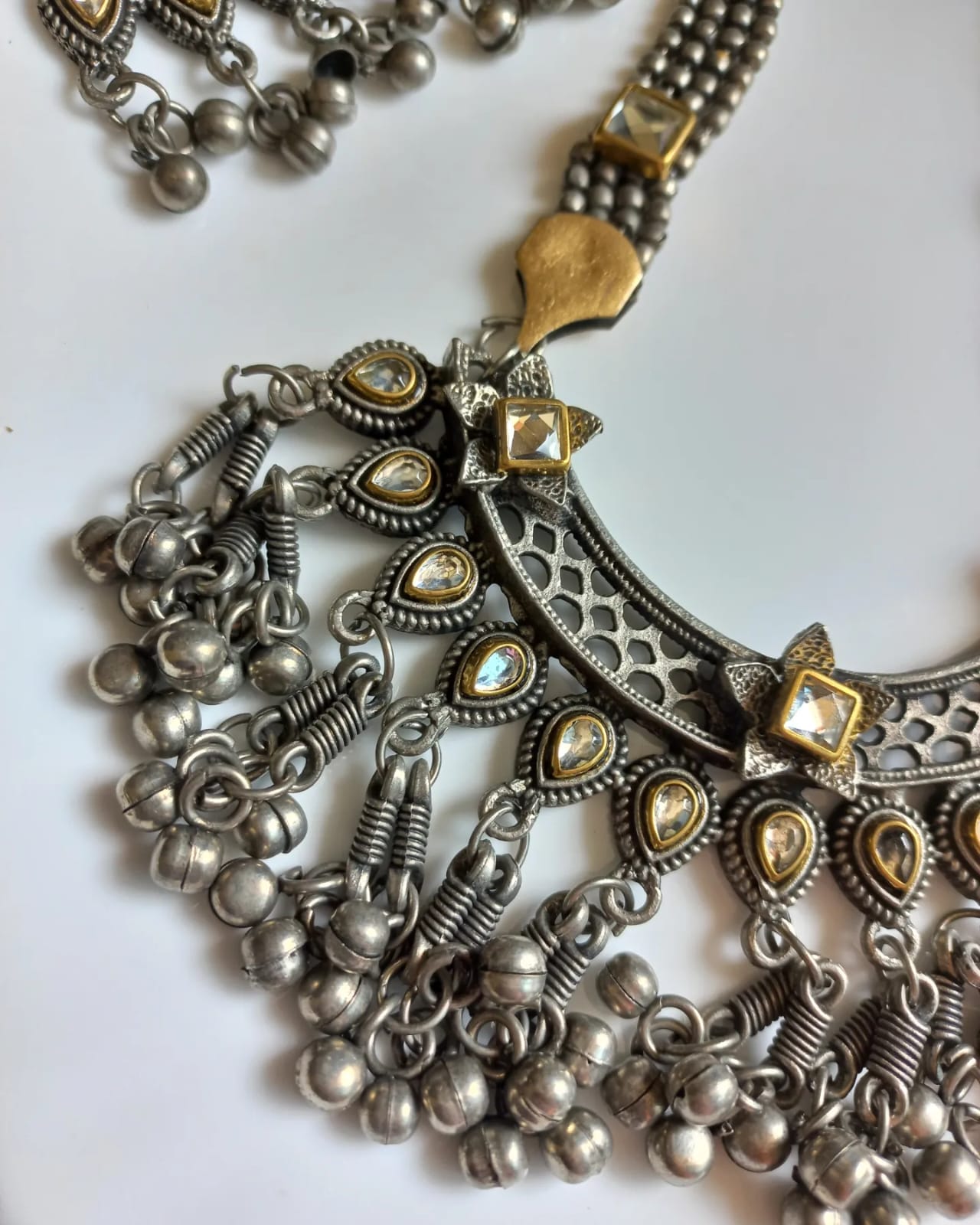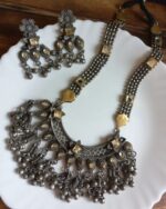 Oxidised long set with matching pair of earrings. This set has kundan stones embellished and long adjustable dori in the back.