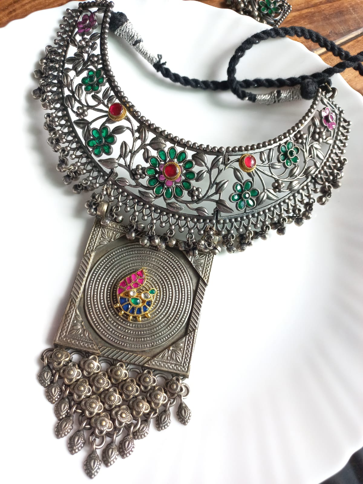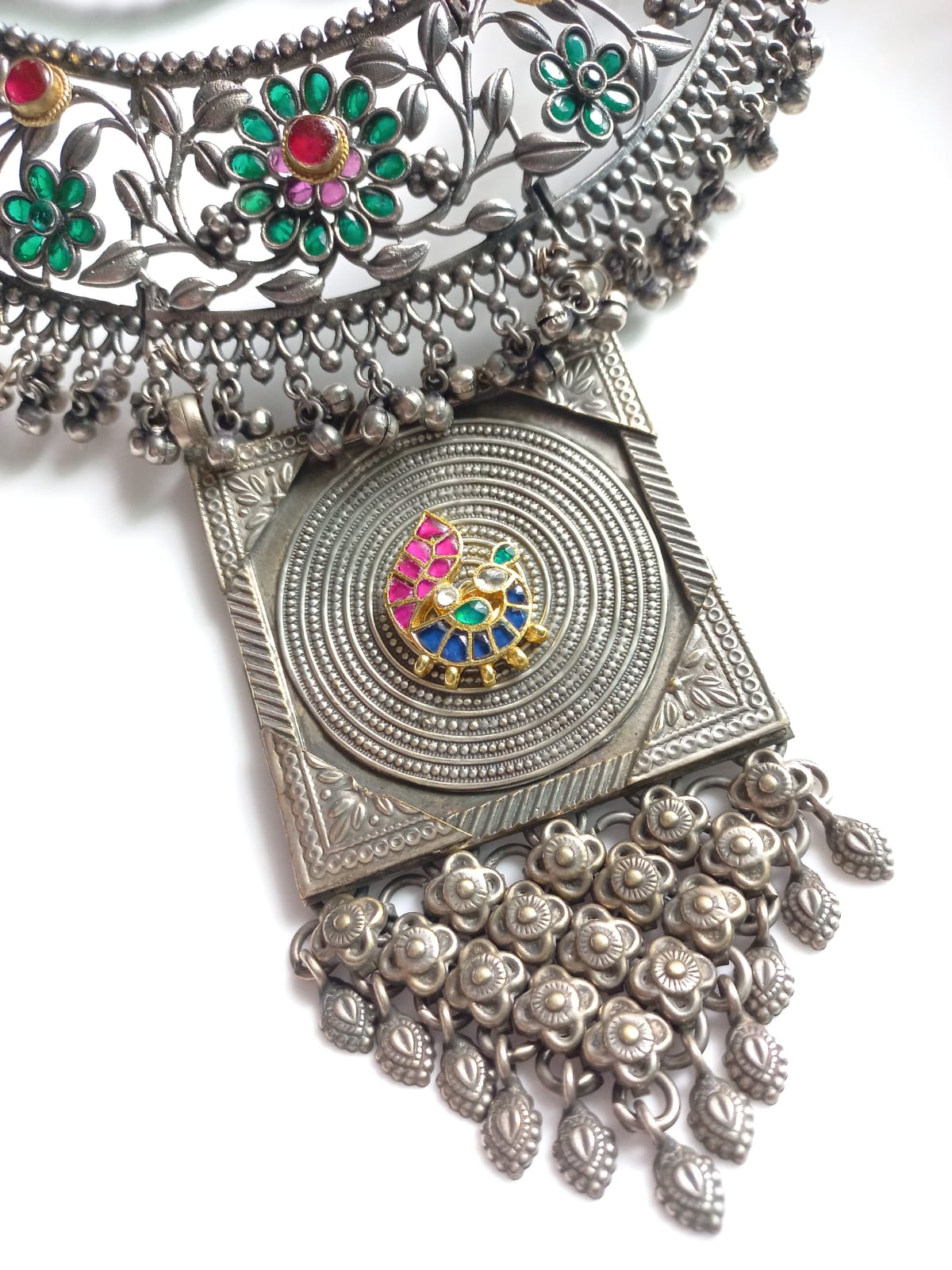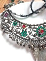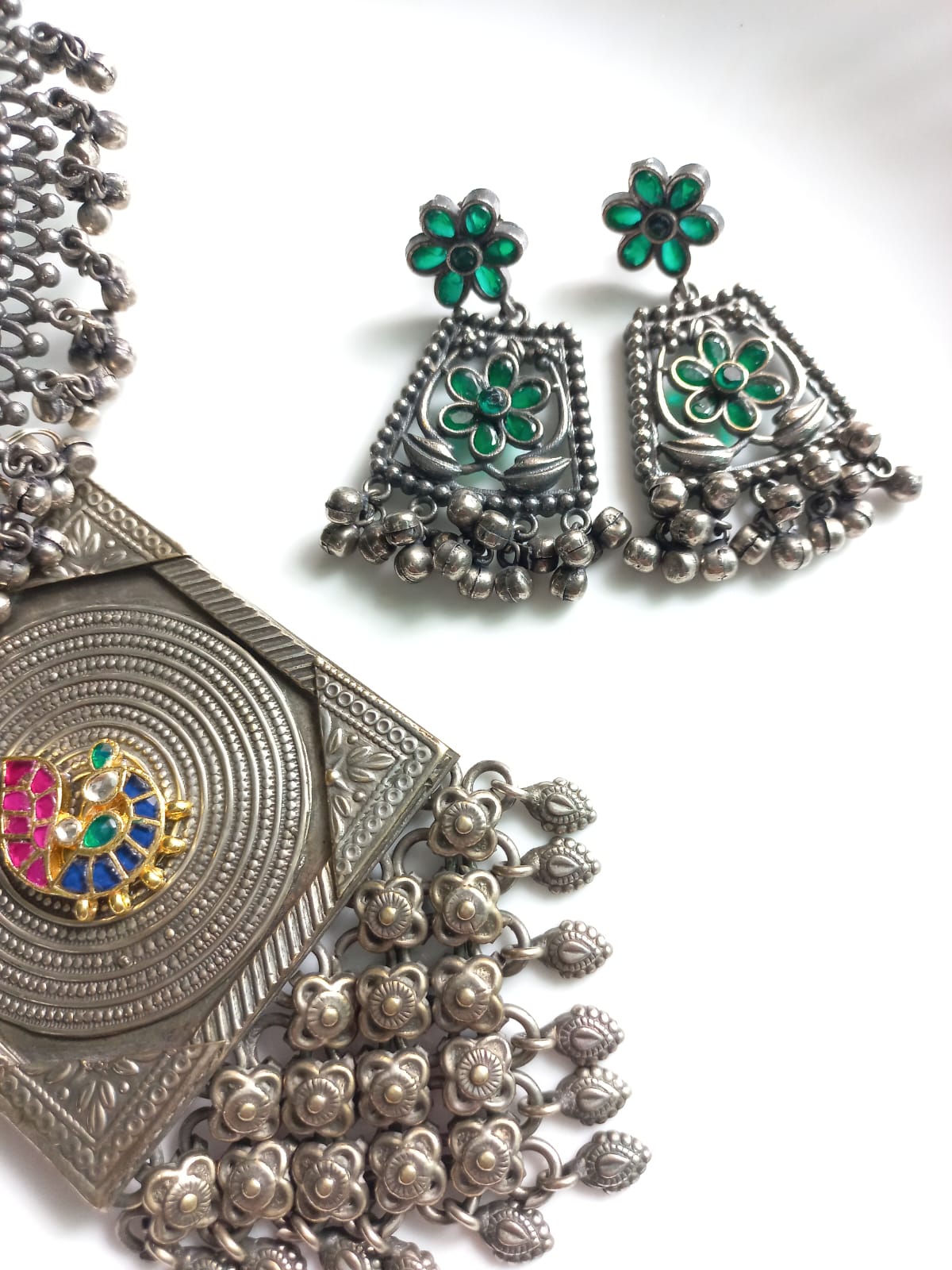This stunning oversized necklace is enough to give you the look of a showstopper. This necklace has real pachi kundan embellished peacock motif with other semi-precious green stone flower motifs. The necklace comes with a matching pair of earrings.