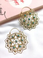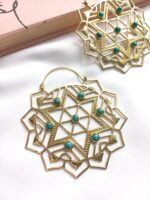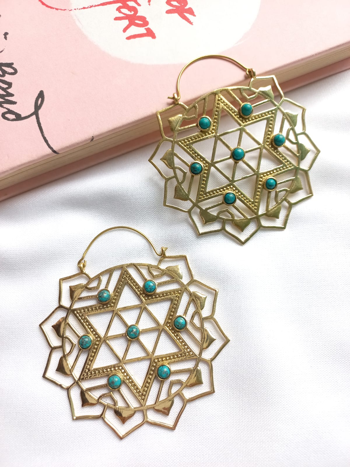 Oversized Mandala turquoise stone hoops. These hoops are completely handmade and made of nickel-free brass metal. These are very lightweight.