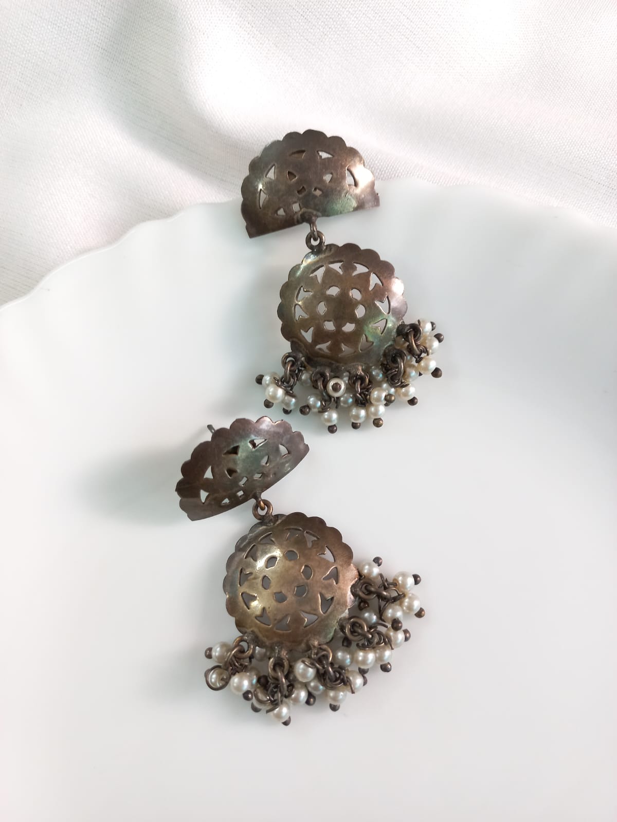 Beautiful jaali design oxidized earrings. This pair is made of pure brass and silver polish to give it the look of real silver jewelry, This pair is very lightweight.