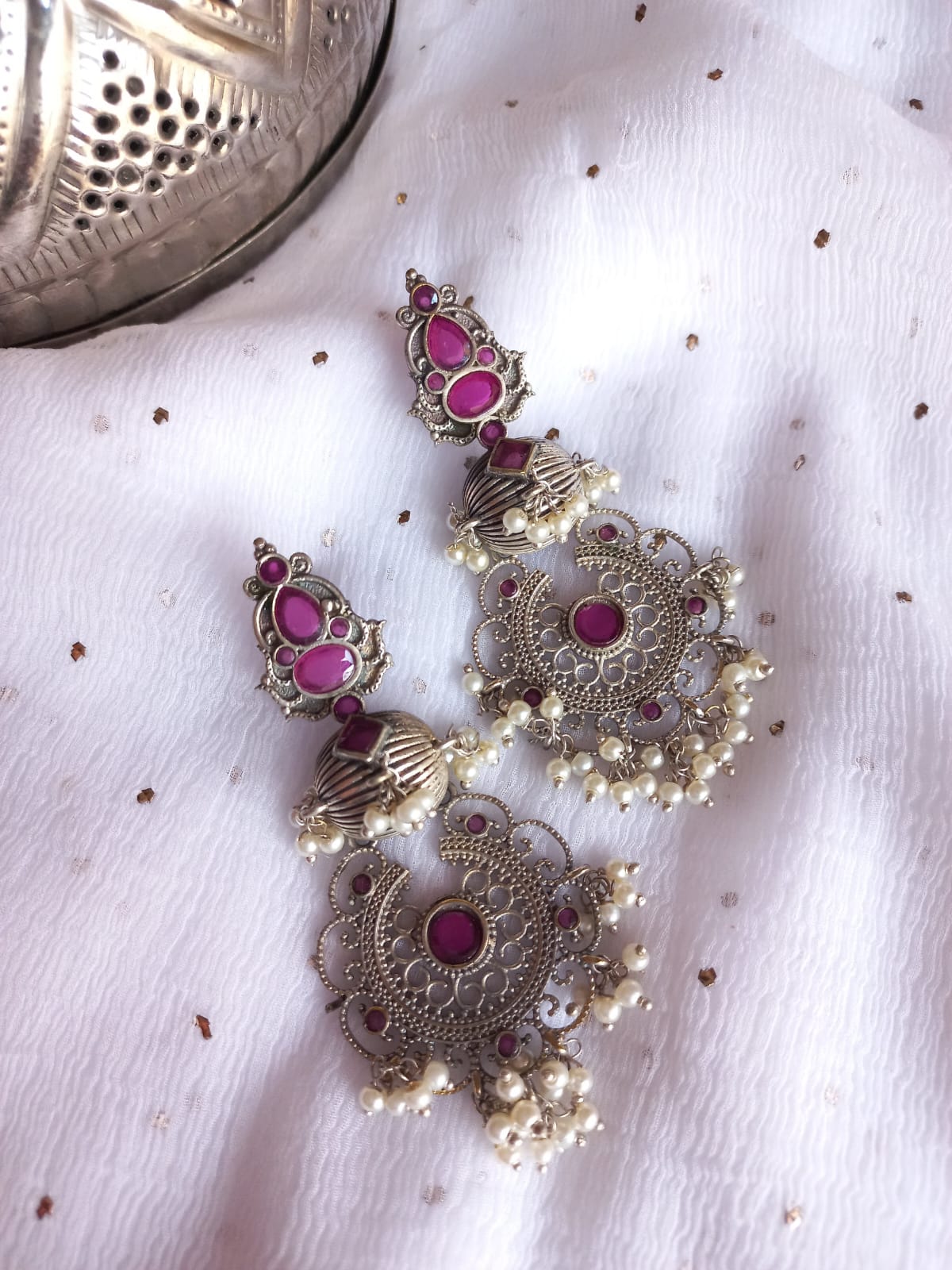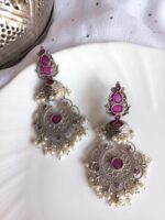 Beautiful pink ruby color intricate pair of earrings. Made of pure brass metal with sterling silver polish on it. This pair is very light in weight.