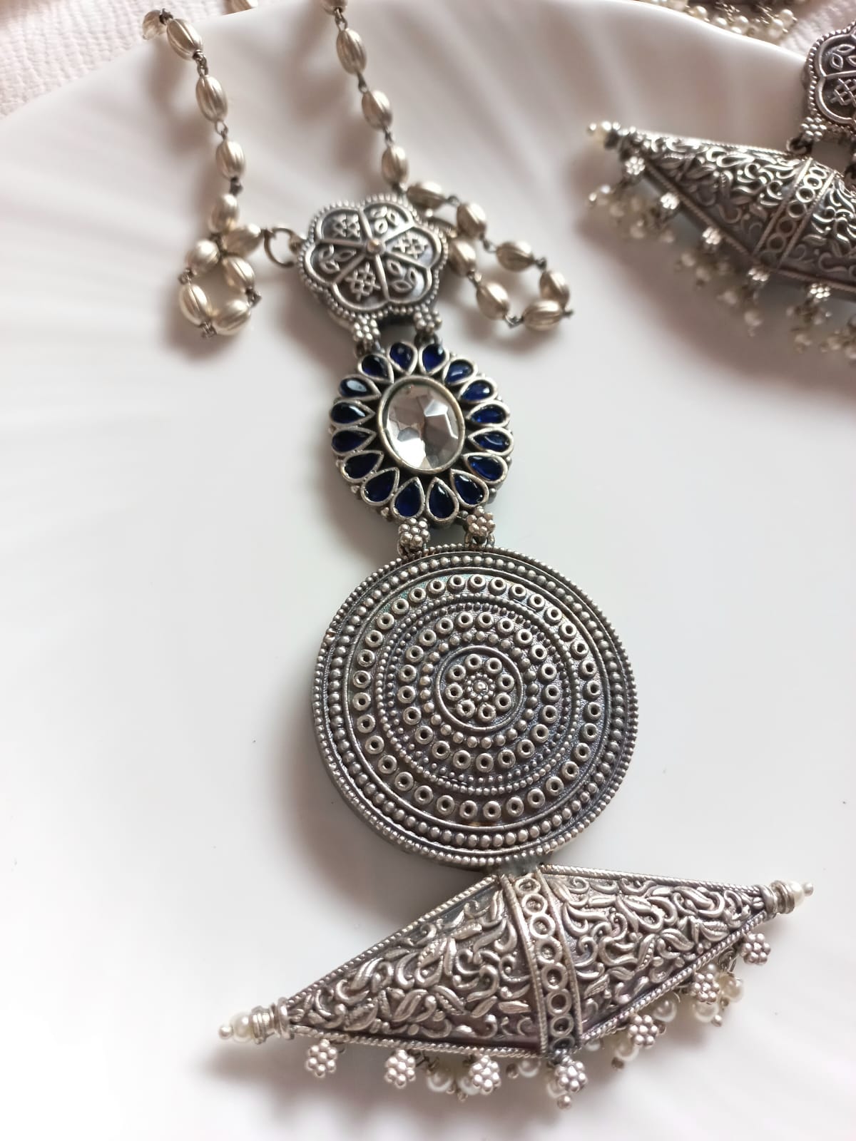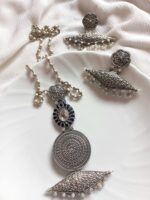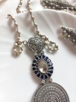 Jewellery sets to make you stand out of crowd. Pure brass made set with silver polished and midnight blue stones studded. It also has long silver ball chain and pair of matching earrings.
